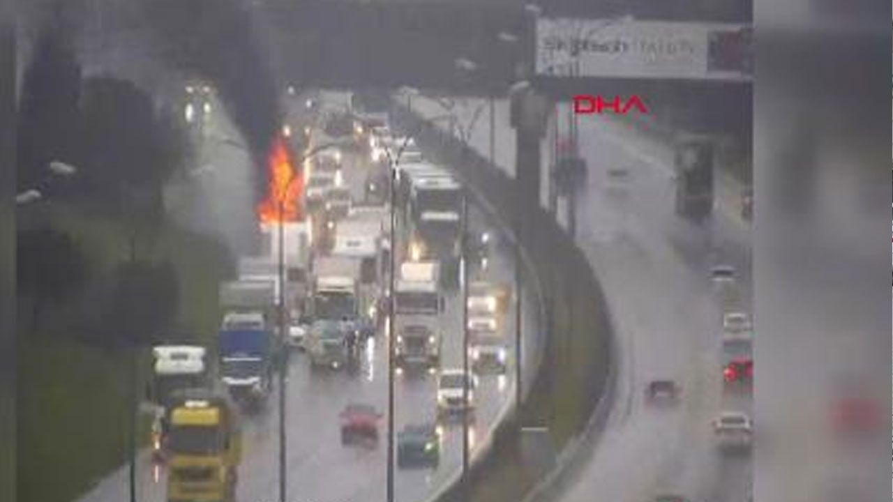 TEM Otoyolu Tuzla Orhanlı mevkiinde ilerleyen TIR'da henüz bilinmeyen bir nedenle yangın çıktı. İtfaiye ekipleri yangına müdahale ediyor.