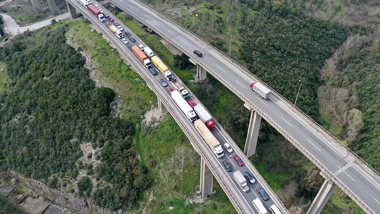 Öte yandan kaza nedeniyle oluşan uzun araç kuyruğu ise dron ile görüntülendi.