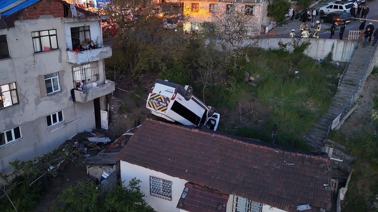 Kaza, dün saat 18.50 sıralarında Çağlayan Mahallesi'nde meydana geldi. Edinilen bilgiye göre, yokuş aşağı ters yönden indiği sırada şoförünün direksiyon hakimiyetini kaybettiği 34 LVU 535 plakalı okul servisi önce takla attı; ardından da evin çatısına düştü. Çevredekilerin ihbarı üzerine olay yerine itfaiye, sağlık ve polis ekipleri sevk edildi. İtfaiye ekipleri araçta sıkışan şoför Mustafa Fedaioğulları'nı bulunduğu yerden kurtardı.
