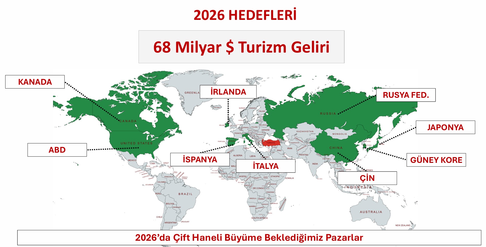 Bakan Ersoy, 2026 yılı için Orta Vadeli Program (OVP) hedeflerine sadık kaldıklarını belirterek, "Yeni hedefimiz 68 milyar dolar. Özellikle Amerika, Çin ve Japonya pazarlarında çift haneli büyüme bekliyoruz," dedi.