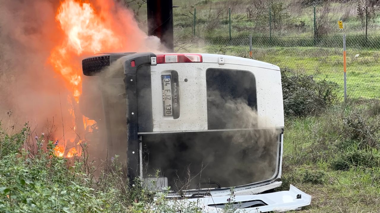 Olay, saat 15.00 sıralarında Kuzey Marmara Otoyolu Tepeören Mevkii'nde meydana geldi. İddiaya göre sağanak nedeniyle kayganlaşan yolda şoförünün direksiyon hakimiyetini kaybettiği 34 FJZ 130 plakalı minibüs yol kenarında bulunan boş araziye uçarak devrildi. Kazanın etkisiyle minibüs kısa sürede alev alev yanmaya başladı. Yoldan geçen vatandaşların alevleri söndürmeye çalıştığı yangında ihbar üzerine bölgeye itfaiye, acil sağlık ve jandarma ekipleri geldi. Alevler itfaiye ekiplerinin müdahalesiyle söndürüldü. Sağlık ekiplerinin kontrollerinde olayda yaralanan kimsenin olmadığı belirlendi. Yangın nedeniyle otoyolda trafik akışı kısa süreliğine kontrollü olarak sağlandı.
