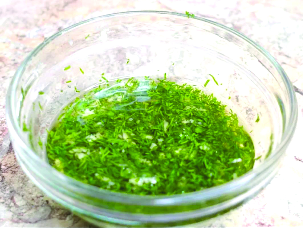 Pampuşkiler pişerken üzerlerini yağlamak için sosu hazırlayalım. Bunu yapmak için yeşillikleri ince ince doğrayın, sarımsağı rendeleyin. Hepsini su, tuz ve bitkisel yağ ile karıştırın.