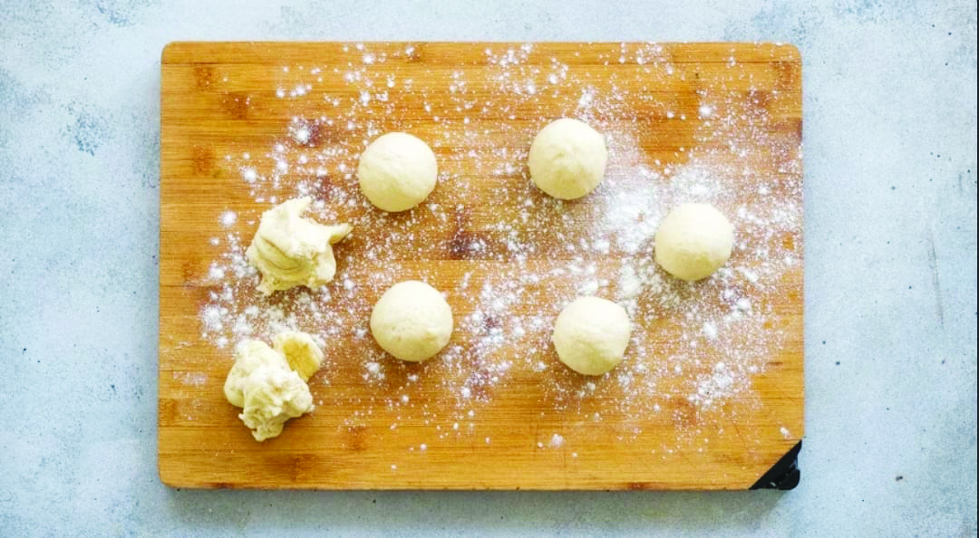 Şimdi çöreklerimizi şekillendirmeye başlayabiliriz. Hamurdan 50 gramlık toplar yapın.
