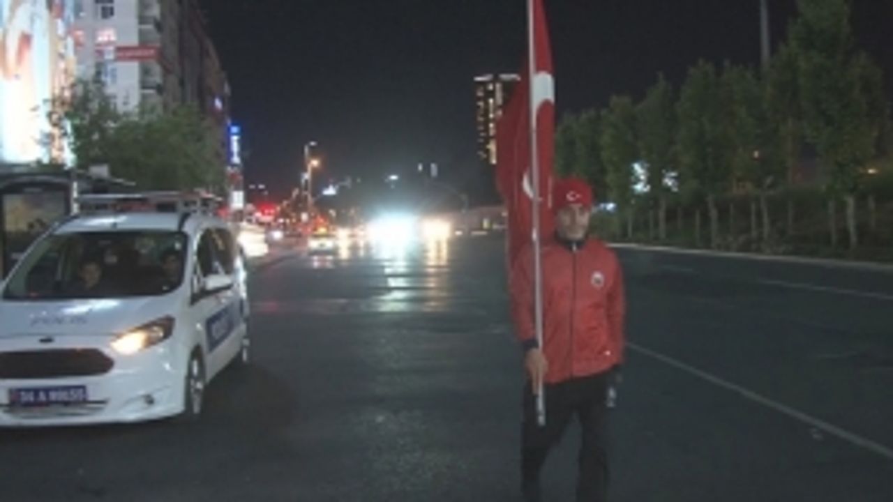 Esenyurt’tan başlayıp 15 Temmuz Şehitler Köprüsünde biten 8 saatlik yürüyüş boyunca elinden Türk Bayrağını bırakmayan Saffet Gümüş’ün yürüyüş anları Mecidiyeköy’de İhlas Haber Ajansı kameralarına yansıdı.