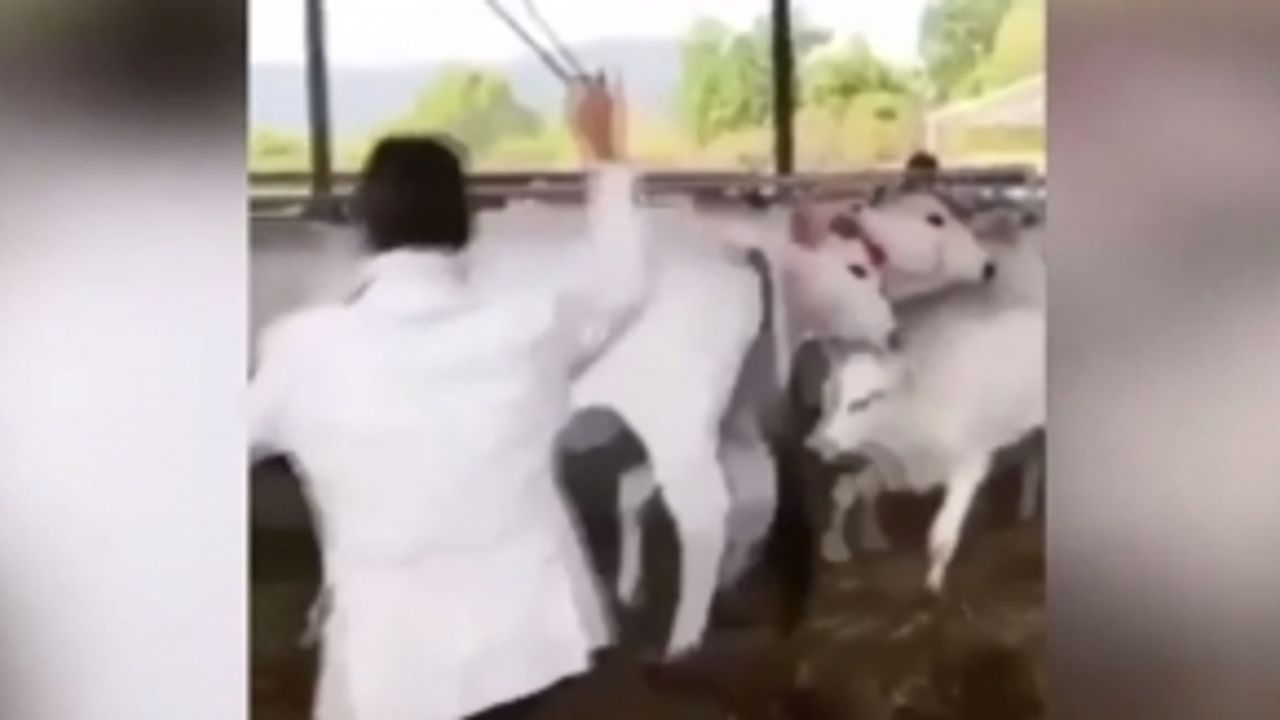 Annesine sopayla vuran adamı yere seren buzağının görüntüleri sosyal medyada büyük ilgi görüyor.