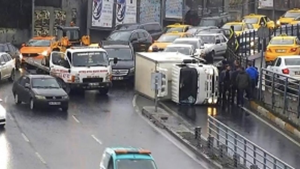 Atatürk Köprüsü girişinde otomobil ile çarpışan kapalı kasa kamyonet devrilerek yan yattı. Sürücülerin yara almadan kurtulduğu kaza nedeniyle Karaköy girişi bir süre kapanırken trafik ise felç oldu.