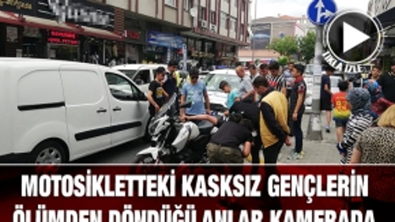 İstanbul Avcılar’da kasksız şekilde motosiklete binen iki genç, hatalı şekilde sokağa girmeye çalışırken bir aracın çarpması sonucu yola savruldu. Motosikletli gençlerin ölümden döndüğü kaza, güvenlik kamerasına yansıdı.