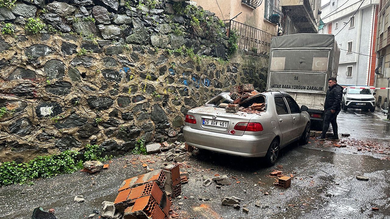 istanbul Kağıthane’de etkili olan yağış sonrası bir evin bahçe duvarı park halindeki otomobilin üzerine devrildi.