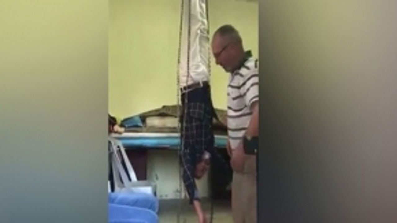 Bel fıtığı tedavisinde ilginç yöntem! Adamı zincirle tavana astılar