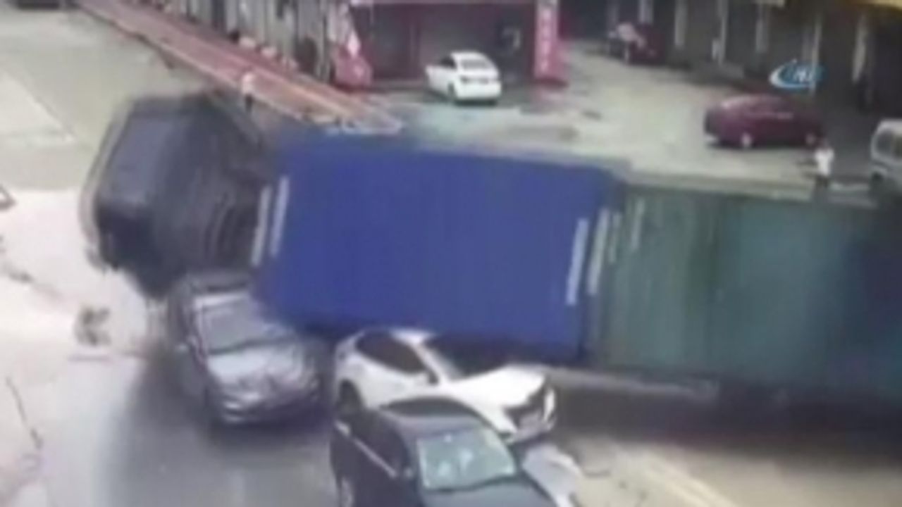 Konteyner yüklü tır araçların üzerine devrildi, feci kaza görüntülere böyle yansıdı. Dehşete düşüren kaza Çin’de meydana geldi. Kontrolden çıkan konteyner yüklü tır, kırmızı ışıkta bekleyen araçların üzerine devrildi. Kaza sonucu...