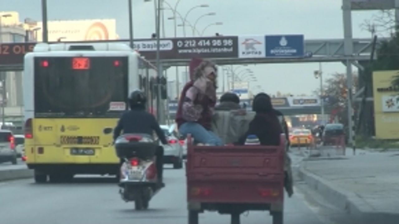 Bahçelievler E-5'te römorklu motosikletin üzerine binen 6 kişi yürekleri ağza getirdi. Aralarında iki çocuk ve 3 kadının olduğu tehlikeli yolculuk, kameralara yansıdı.