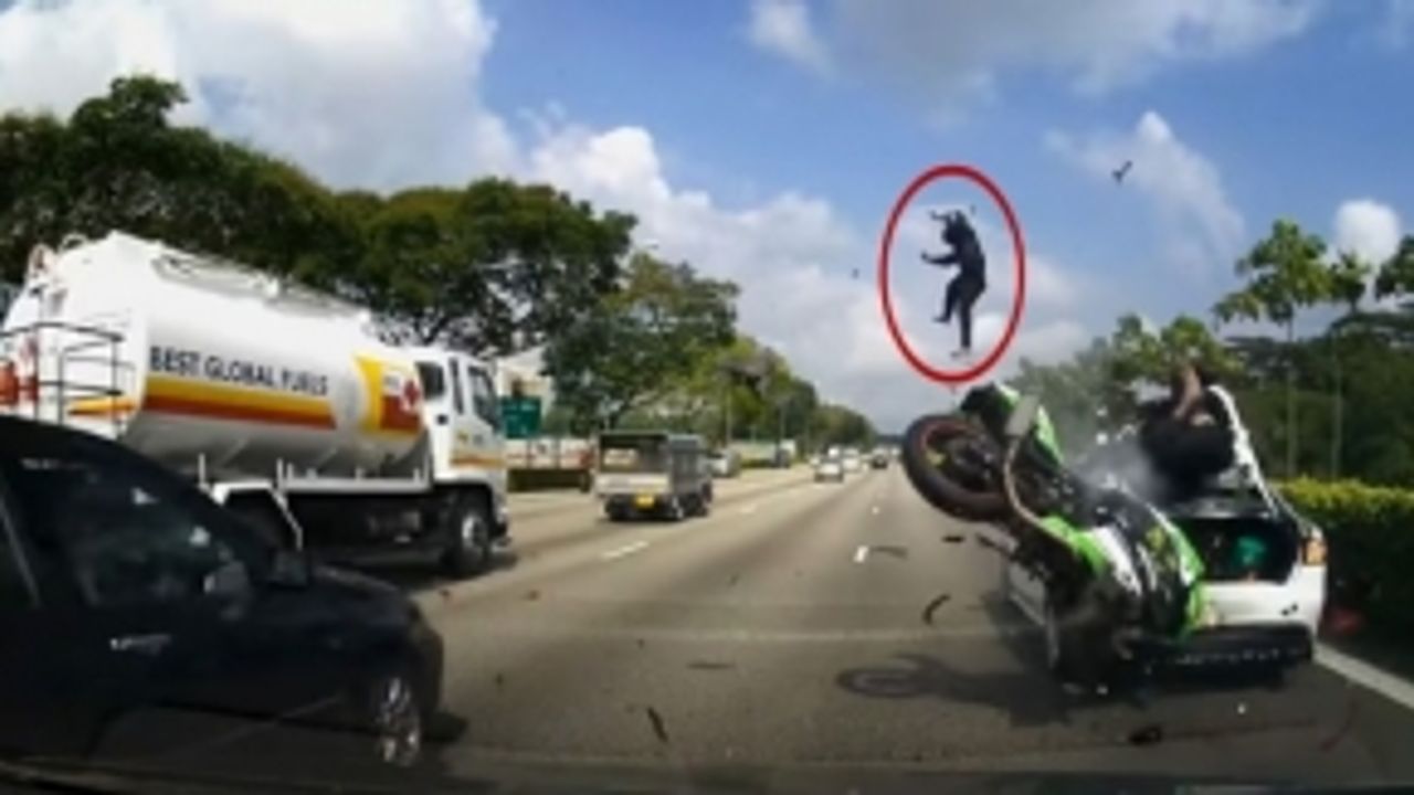 Singapur'da motosiklet ile otoyolda ilerleyen iki kişi, yolda duraklama yapan bir aracı farkedemeyince korkunç anlar yaşandı. Araç kamerasına yansıyan görüntülerde hızla gelen motosiklet yolda duran araca arkadan çarpıyor ve motosikletin...