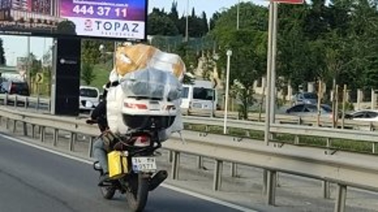 E-5 karayolunda motosikletinde aşırı yük ile seyir halinde olan sürücü, hem kendini hem de trafiği...