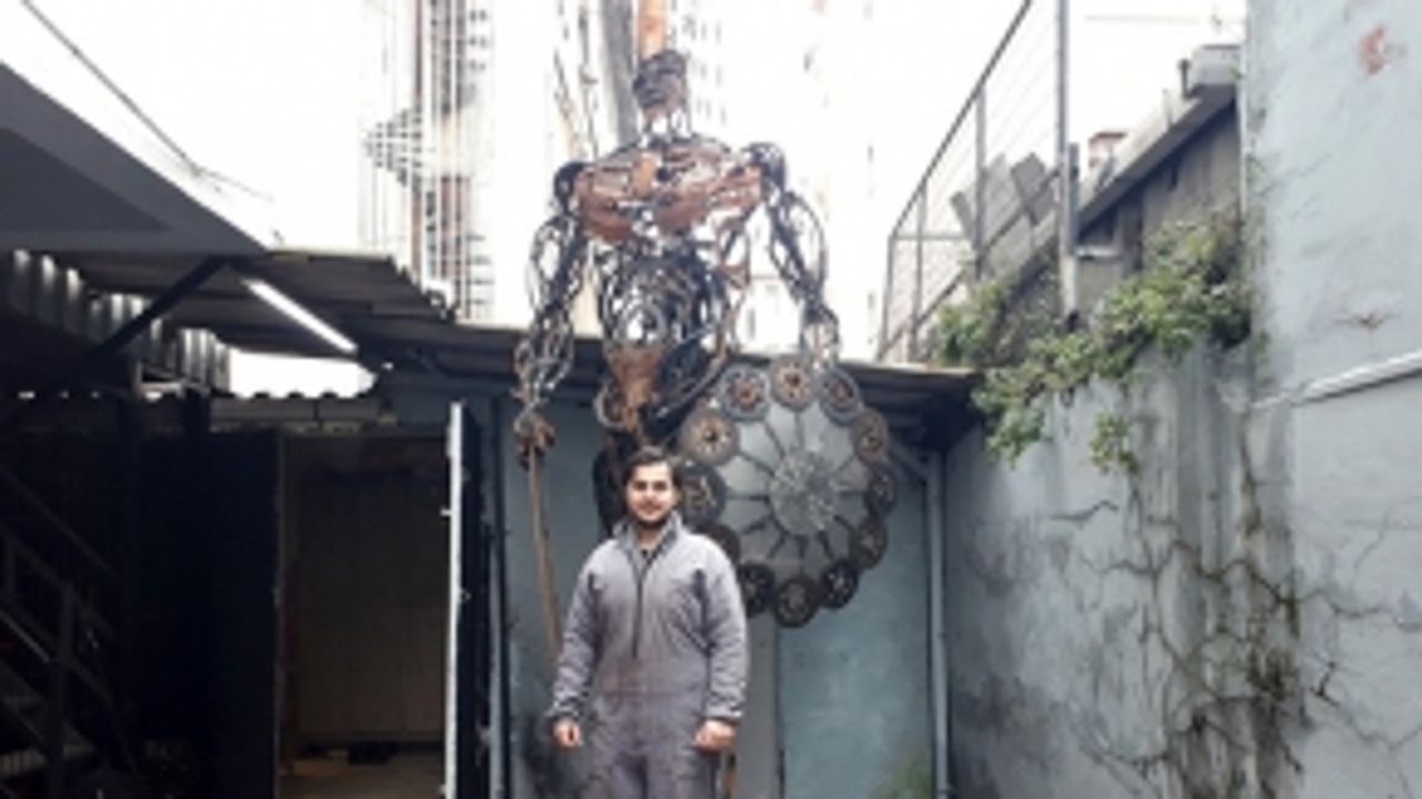 Bahçelievler’de Otomasyon Teknolojisi bölümü mezunu Ali Diyar, atölyesinde biriktirdiği hurda araba ve eski makine parçalarından 4,5 metre uzunluğunda "yeniçeri" heykeli yaptı.