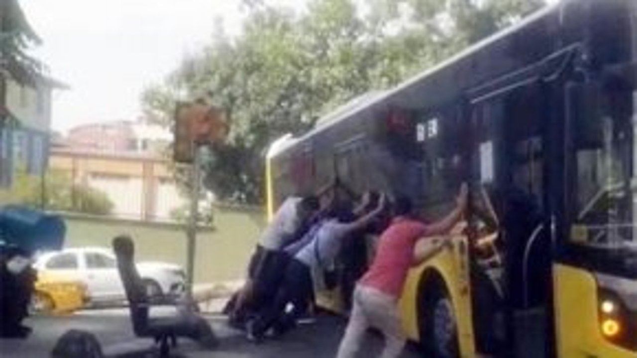 Bayrampaşa’da İETT otobüsü yol çalışmasının bulunduğu bölgede askıda kaldı. Vatandaşların ittirerek İETT otobüsünü kurtardığı anlar cep telefonu kamerasına yansıdı.