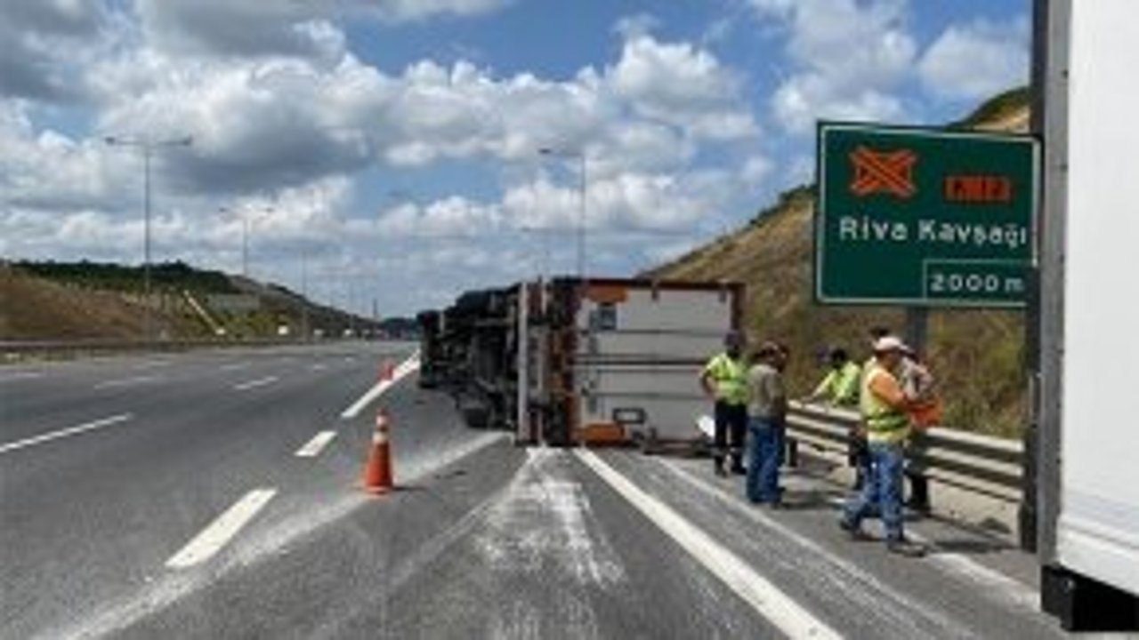 Kuzey Marmara Otoyolu Riva Kavşağı mevkiinde seyir halindeki kırmızı et yüklü tır devrildi. Kazada yan yatan tırın sürücüsü hafif yaralandı.