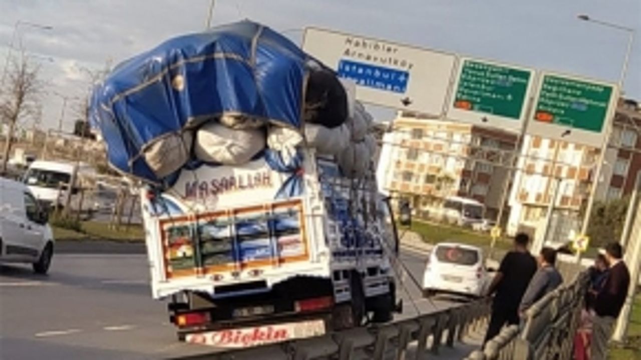 Sultangazi’de aşırı yük nedeniyle makas kıran kamyonetin devrilmemesi için iple bariyere bağlanıp kamyona yaslanıldığı...