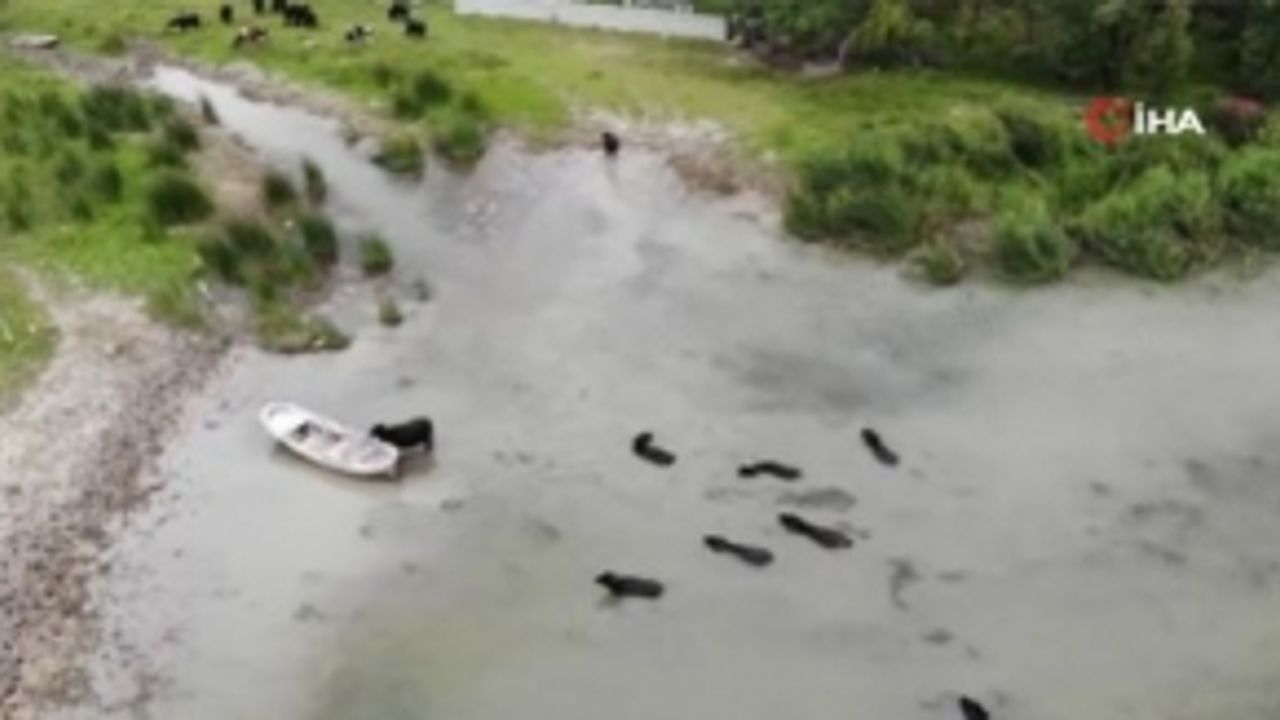İstanbul'da sıcakların artmasıyla birlikte Arnavutköy’de mandalar Terkos Gölü'ne girerek serinledi. Mandaların göldeki halleri renkli görüntüler oluşturdu.