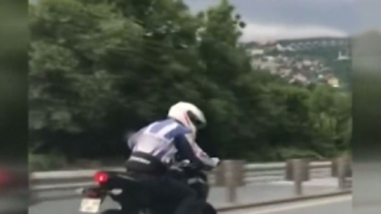 İstanbul Sarıyer'de bir motosiklet sürücüsü, motosikletin üzerine yatarak kullandı. O anlar cep telefonu kamerasına böyle yansıdı.