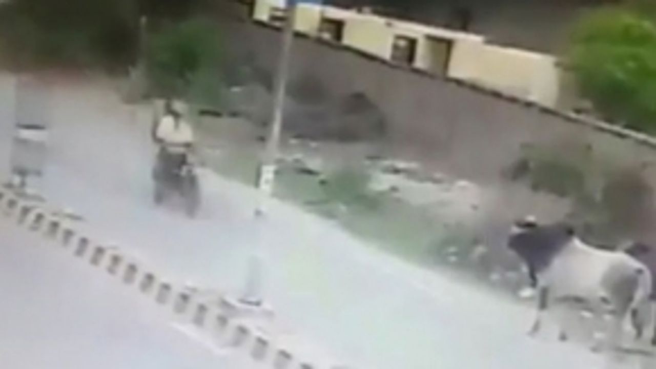 Hindistan'da trafikte ilerleyen motosikletli, yol kenarındaki iki boğadan birinin hedefi oldu. İlk motosikletliyi teğet geçen boğa, ikincisini boynuz darbesiyle yere yıktı. Kafasını refüjün kenarına çarpan sürücünün akıbeti bilinmiyor.