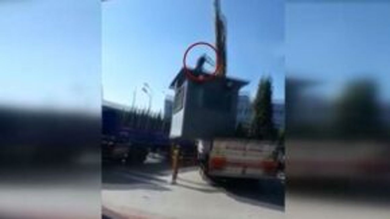 Vinç ile kaldırılan güvenlik kabini üzerine çıkan kişinin ölümden döndüğü anlar amatör kamera tarafından saniye saniye görüntülendi. Olay Ankara Sincan'daki Organize Sanayi'nde meydana geldi. TIR dorsesindeki zırhlı güvenlik kabini vinç...