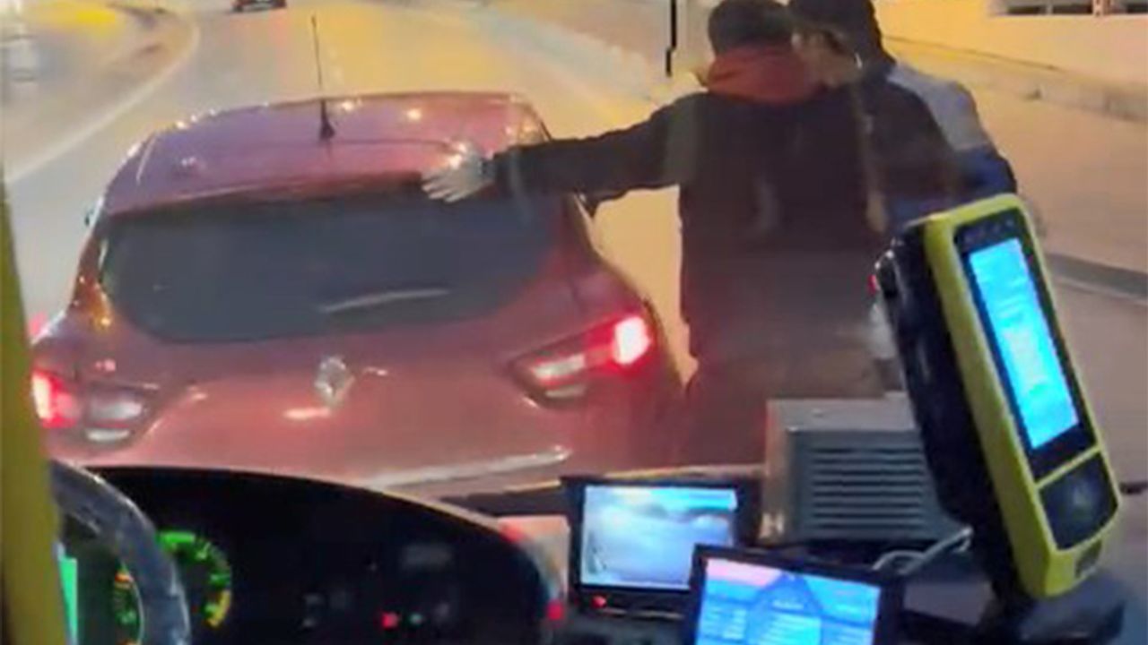 KADIKÖY'de otomobil sürücüsü seyir halindeki İETT otobüsünü sıkıştırdı. Trafikte tehlikeye neden olan hareketi sonrası sürücü ile yolcular arasında tartışma çıktı. Sürücü otobüsten inerek tepki gösteren yolculardan birinin üzerine de otomobilini sürdü. O anlar çevredekiler tarafından cep telefonu kamerasıyla kaydedildi.