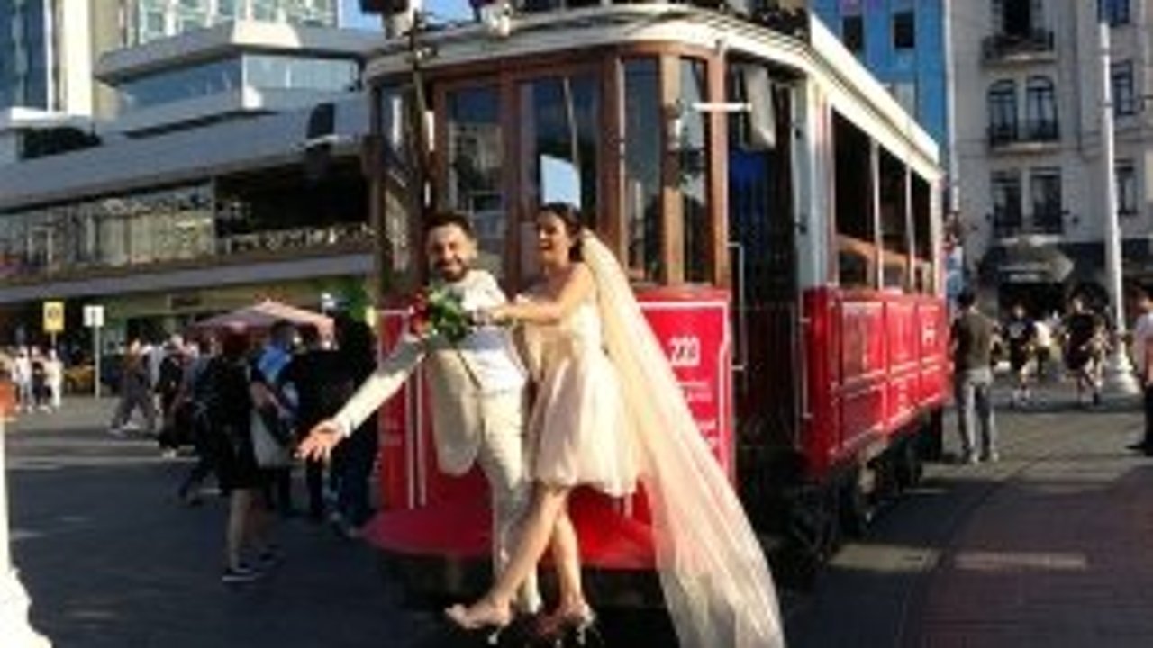 Fotoğraf çekimi için Taksim Meydanı’na gelen gelin ve damadın tramvay üzerindeki fotoğraf çekimi renkli görüntüler oluşturdu. Çevredeki vatandaşlar...