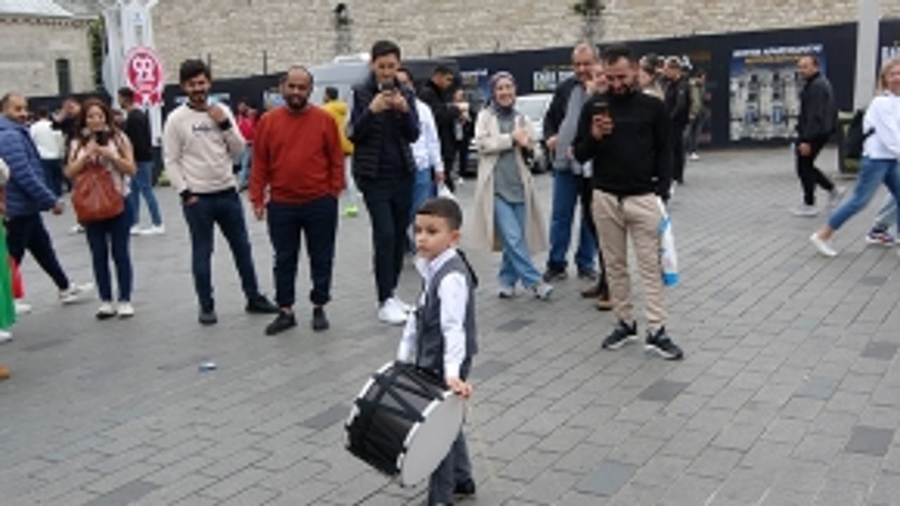 Taksim’de eline aldığı davulla gösteri yapan minik turistlerden ve vatandaşlardan yoğun ilgi gördü. Minik davulcunun...