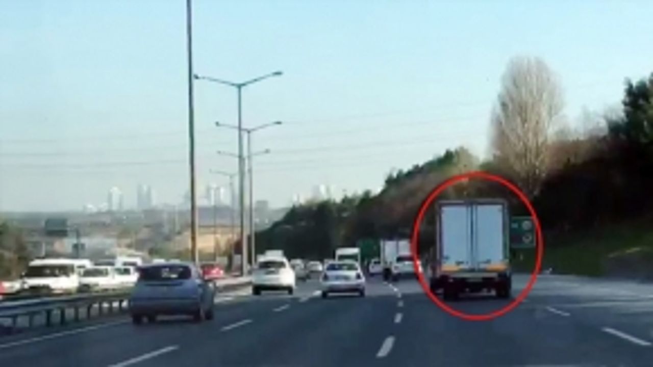 TEM Otoyolu Gaziosmanpaşa mevkiinde tehlikeli hareketler yapan kamyon sürücüsü, kazaya davetiye çıkardı. Trafik magandasının tehlikeli şovu, arkasından gelen sürücü tarafından saniye saniye görüntülendi.