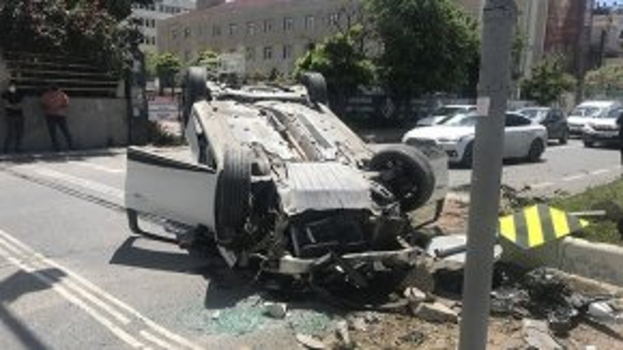 Büyükçekmece’de seyir halindeki otomobilin çarptığı araç, trafik ışığı direğine çarpıp takla attı