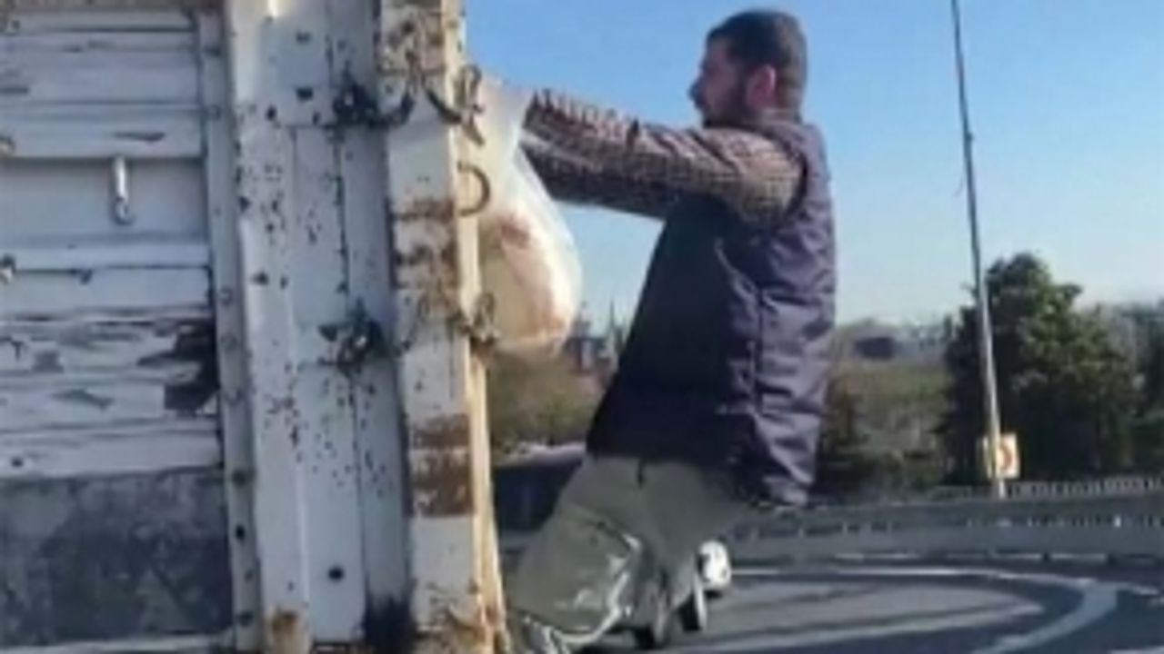 Tuzla D-100 karayolunda kamyonet kasasına tutunarak yolculuk eden vatandaşın o anları cep telefonu kamerasına yansıdı. Vatandaş, kendisini görüntüleyen bir başka sürücünün ‘İnternete atacağım’ demesi üzerine ‘Çek çek’ diyerek tepki gösterdi.