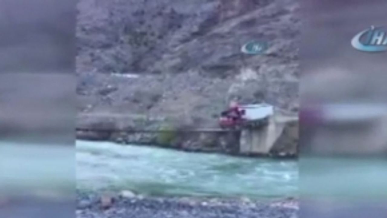 Artvin'in Yusufeli ilçesi Çoruh Nehri üzerindeki çelik halatlı ahşap köprüden üzerindeki tonlarca ağırlığındaki yükle geçen kamyon sürücüsü yürekleri ağza getirdi.