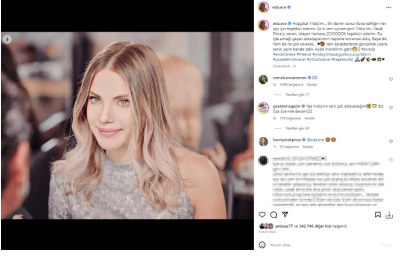 Son bölümün ardından Instagram hesabından bir veda paylaşımı yapan Eda Ece, Hoşça kal Yıldız'ım... Bir devrin sonu! Bana kattığın her şey için teşekkür ederim.
